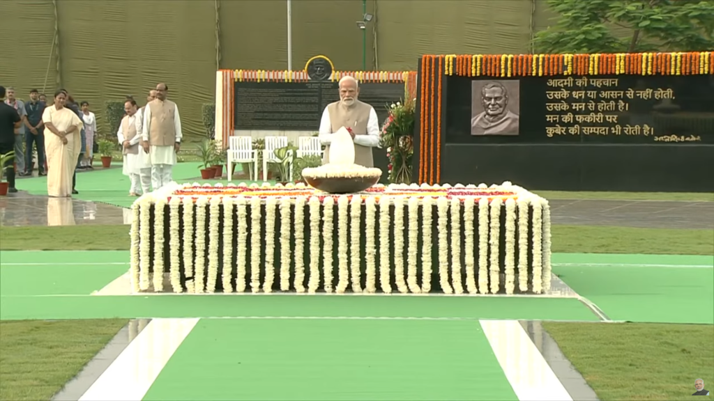 முன்னாள் பிரதமர் அடல் பிஹாரி வாஜ்பாயின் 7 ஆவது ஆண்டு நினைவு இன்று அனுசரிக்கப்படுகிறது. இதையொட்டி டெல்லியிலுள்ள அவரது நினைவிடமான ‘சதைவ் அடல்’ நினைவிடத்தில் குடியரசுத் தலைவர் திரௌபதி முர்மு, பிரதமர் நரேந்திர மோடி உள்ளிட்டோர் மலர் தூவி அஞ்சலி செலுத்தினர்.