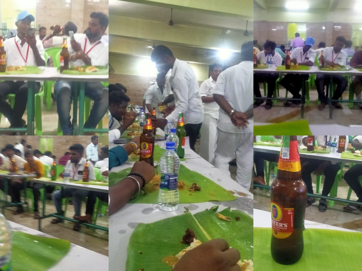 சாப்பாட்டு மேஜையின் மீது இலையுடன் ஆளுக்கு ஒரு பீர் பாட்டில் வைத்து புகைப்படம் எடுத்துக் கொண்டு இருக்கும் காட்சிகள், புகைப்படங்கள் தற்போது சமூக வலைதளத்தில் வைரலாகி பரபரப்பாக பேசப்பட்டு வருகிறது.