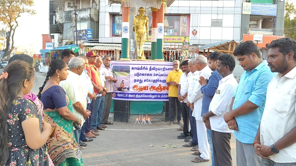 ஜம்முகாஷ்மீர் மாநிலம்,பஹல்காம் பகுதியில் தீவிரவாத தாக்குதலில் உயிரிழந்த 28 பேருக்கு கள்ளக்குறிச்சி மாவட்டம் திருக்கோவிலூர் பகுதியில் திருக்கோவிலூர் ரோட்டரி சங்கத் தலைவர் செந்தில்குமார் தலைமையில், மெழுகுவர்த்தி ஏத்தி,மலர் தூவி மௌன அஞ்சலி செலுத்தப்பட்டது. இதில் முன்னாள் தலைவர் எஸ்.எஸ்.வாசன், பொருளாளர் சௌந்தரராஜன் முன்னாள் ராணுவ வீரர் கல்யாணகுமார் ரோட்டரி சங்க உறுப்பினர்கள் காமராஜ், முத்துக்குமாரசாமி,முருகன், கார்த்திக், அமரஜோதிபாபு, நடராஜன்,சாந்தி பால்,மூர்த்தி, ஆர்சிசி உஒரேதேசம் அறக்கட்டளை தலைவர் ஹரிகிருஷ்ணன்